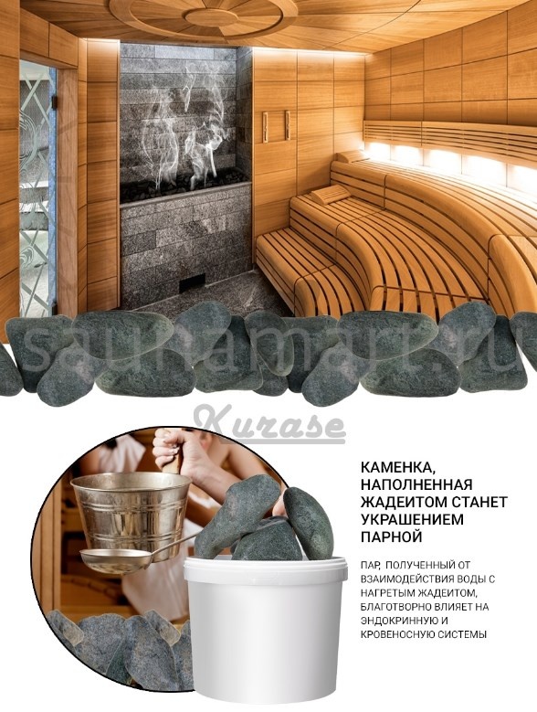 При контакте с водой, жадеит выделяет небольшое количество метакремниевой кислоты, тем самым, наделяя получающийся пар целебными свойствами. Посещение парной, где используются эти полудрагоценные камни, окажет положительный эффект на Вашу кожу, кровеносную систему и общее самочувствие. В случае, если Вы применяете лекарственные препараты, в особенности, созданные на травяной основе, их действие усилится после посещения парной с камнями из жадеита.
