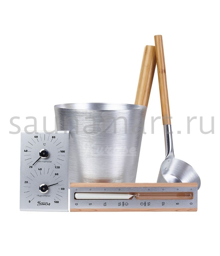 Банные принадлежности и аксессуары, которые входят в набор: ушат, черпак, песочные часы, термогигрометр. Выполнены из алюминия в цвете серебро с деревянными элементами из бамбука. Ушат для бани предназначен для мытья, кадушка для обливания, разведения ароматических масел, как запарник для настаивания трав. Банное ведерко применяют для запаривания веника банного, как таз для воды и обливное ведро, ковш для поливания каменки. Для удобства, шайка для бани оснащена деревянной ручкой, которая убережет руки от ожога.