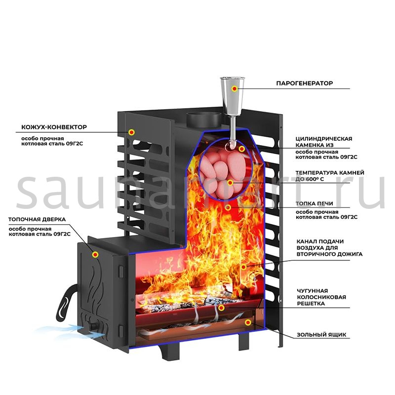 - Материал закрытой каменки: особо прочная котловая сталь 09Г2С