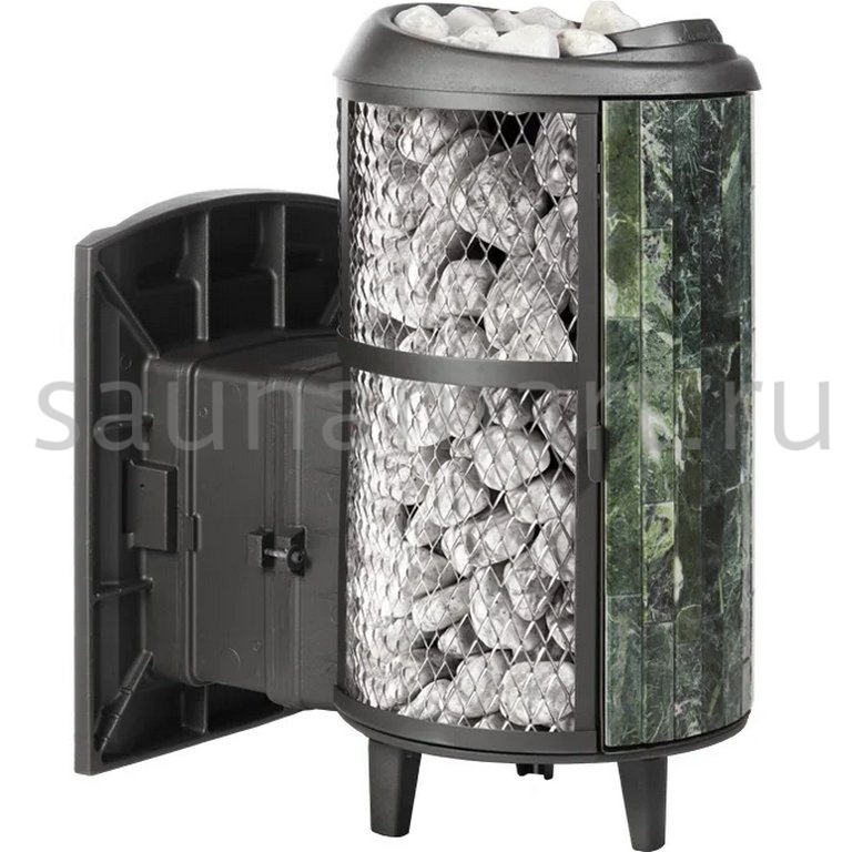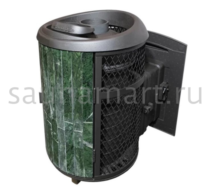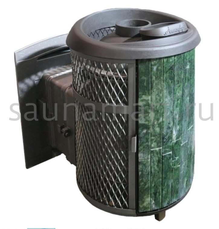 Модель с комбинированной облицовкой из нержавеющей сетки и ламелей. Особенностью данной модели является открывающаяся дверь с ламелями, что обеспечивает быстрый прогрев парной.