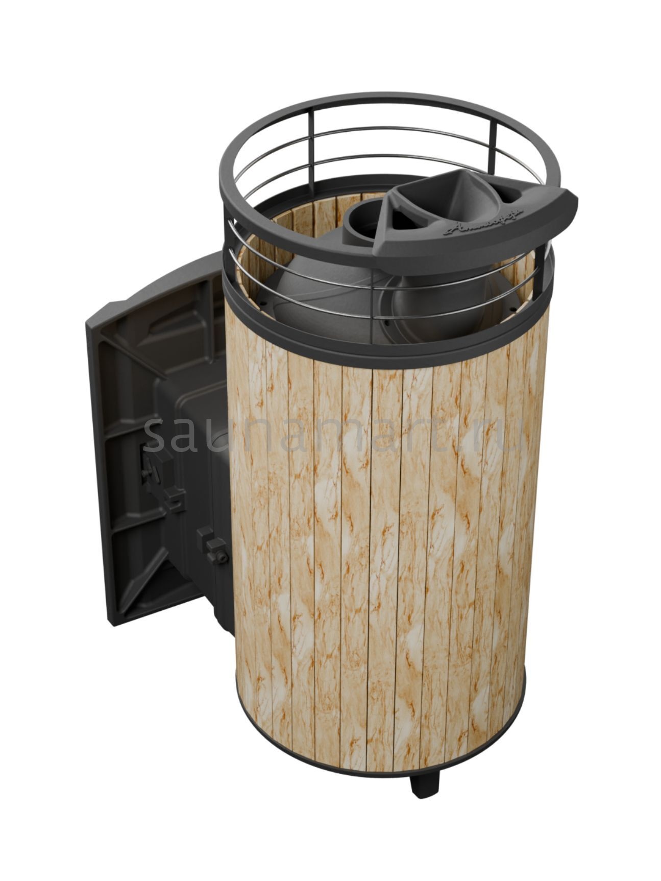 Модель с увеличенной каменкой и повышенной производительностью. Ламели по периметру внешней каменки не только обладают хорошими теплонакопительными свойствами, но и придают печи оригинальный внешний вид