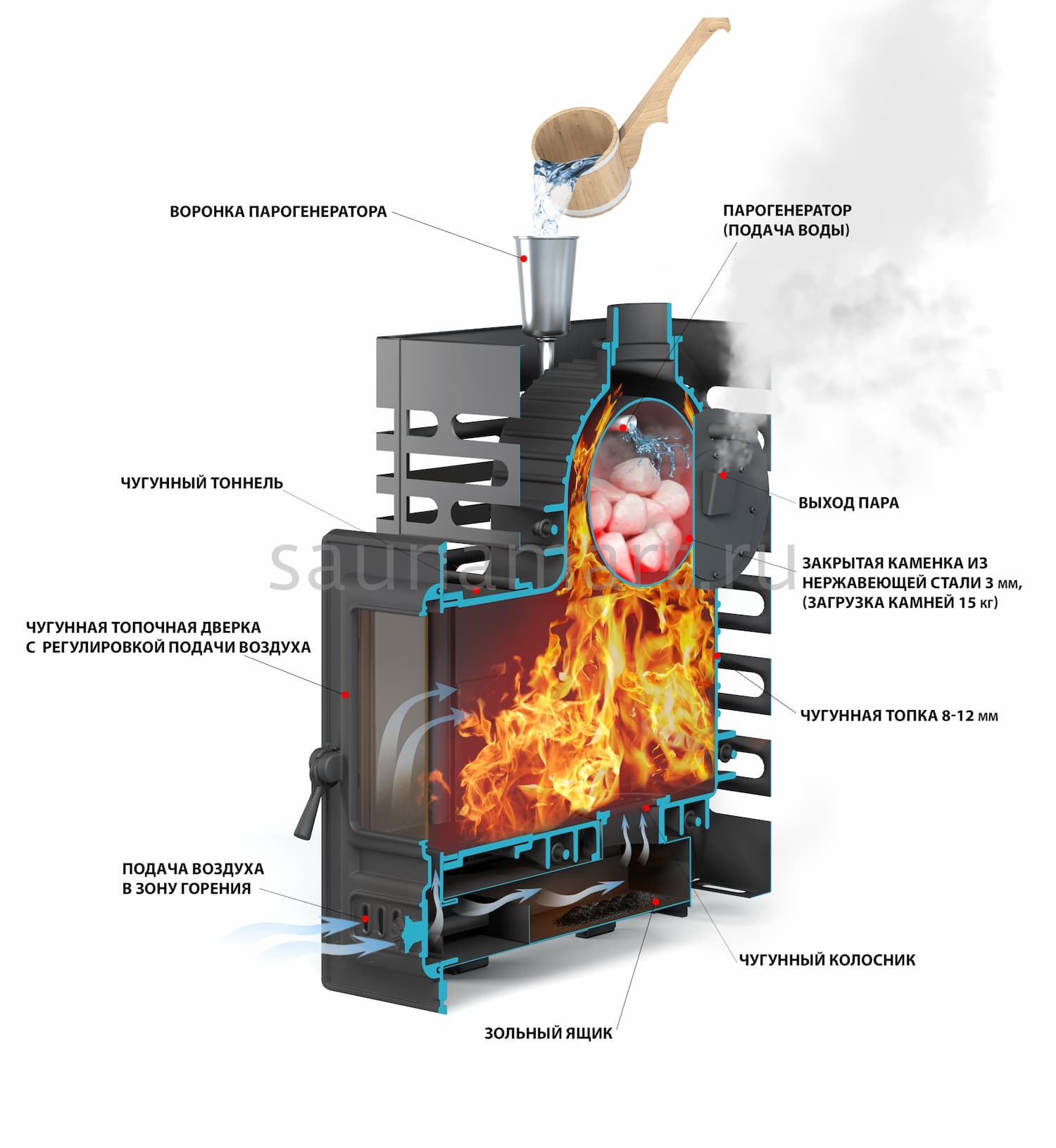 Преимущество печей ASTON: Конструкция разработана для максимальной тепловой эффективности при минимальном расходе ресурсов - времени и топлива. Каменка и корпус имеют скошенные поверхности, что обеспечивает свободное движение дымовых газов без образования "дымовых карманов". Такая геометрия позволяет всем частям печи прогреваться равномерно как по температуре, так и по времени, обеспечивая полное сгорание топлива и быстрый результат.