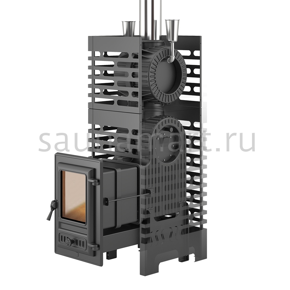 Комплект состоит из чугунной банной печи Астон Шторм 18 и чугунной натрубной каменки Турбопар. Объединение двух конструкций в единую систему заметно увеличивает тепловую отдачу термоагрегата, предотвращает перегрев дымохода, организует дополнительную каменку для получения качественного пара.