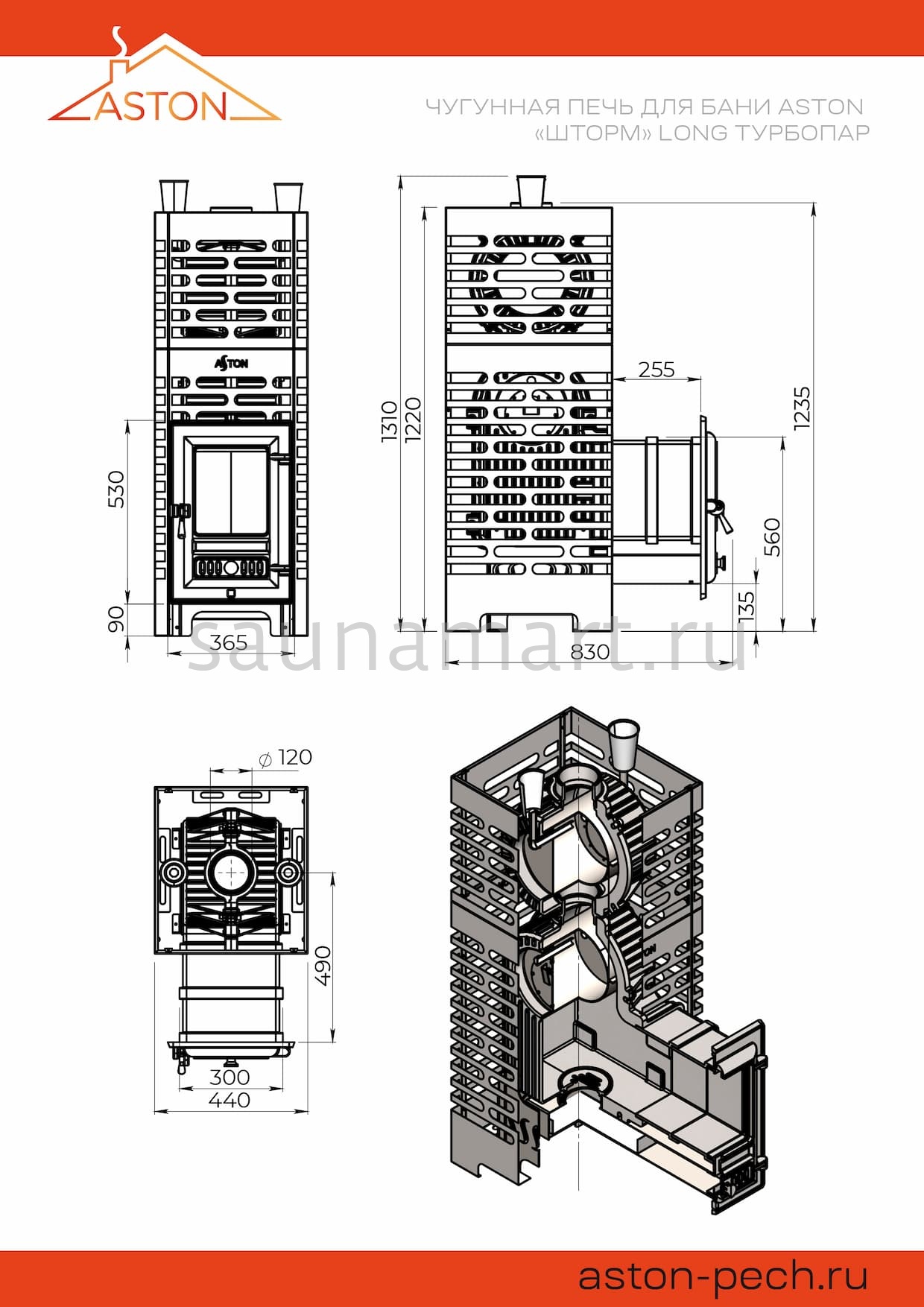 Печь дровяная чугунная ASTON Шторм 26 Турбопар Long дверца 350
