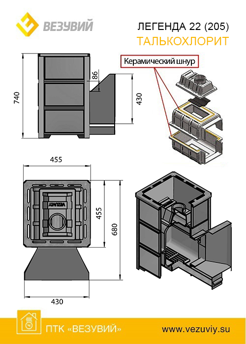 Печь дровяная ВЕЗУВИЙ Легенда 22 талькохлорит дверца 205