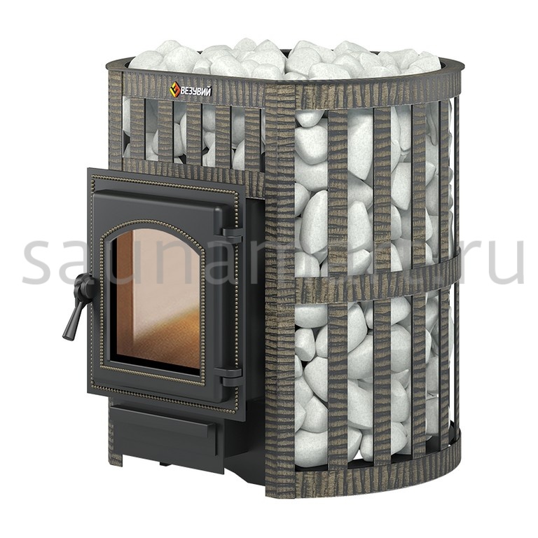 Банная чугунная печь Легенда Ковка 16 (270) укомплектована чугунной герметичной дверцей Везувий 270 с жаропрочным стеклом «SCHOTT ROBAX». Конвекционно-вентилируемый кожух "Ковка" изготовлен из металлической текстурированной полосы, покрашенной термостойкой краской и покрытой патиной «Бронза».