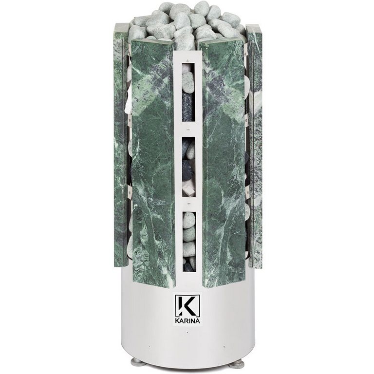 Электрокаменка Karina Forta 10 Змеевик предназначена для использования в парных объемом до 14 м?. Печь выполнена в напольном варианте и обладает цилиндрической формой, дополненной плитами из натурального камня Змеевика.