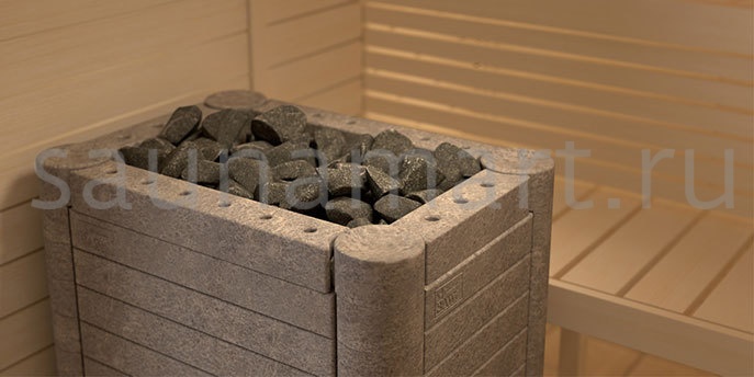 Благодаря каменной поверхности печь очень быстро прогревает помещение парной объёмом 10-18 метров кубических. Расход электроэнергии при этом весьма экономичен, так как каменная облицовка длительное время сохраняет тепло. Помимо облицовки из талькохлорита, в данную модель вмещается до 50 кг камней, что делает площадь испарения поддаваемой на электрокаменку жидкости колоссальной. Вы сможете в считанные мгновения добиться требуемого уровня влажности, наполнив парную легким мелкодисперсным паром.