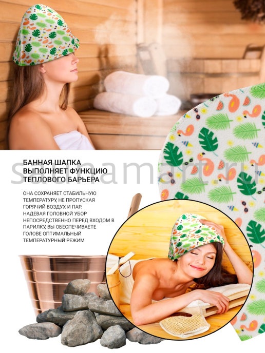 Шапка это необходимый атрибут для похода в баню или сауну. Высокая температура и сухой воздух в парной могут вызвать перегрев и ожоги кожи головы. Шапка для бани убережет голову, уши и волосы от высокой температуры и перегрева. Если пренебрегать защитой головы с помощью шапочки, то волосы теряют влагу и становятся ломкими и сухими. Помимо термоизоляционных свойств банная шапка обладает отличными гигроскопичными свойствами - прекрасно впитывает влагу и пот, что сделает Ваше пребывание в парной более комфортным. Головной убор для бани выполнен из натурального материала – войлок. Материал достаточно пористый, за счет чего создает своеобразный защитный барьер по принципу термоса, для изоляции от высокой температуры. Стильный, яркий, необычный рисунок выделит Вас и подчеркнет Вашу индивидуальность. После применения расправьте шапку и просушите. Размер универсальный. Мы предлагаем Вам не только эффективное средство защиты от перегрева, но и стильный яркий аксессуар для бани и сауны.